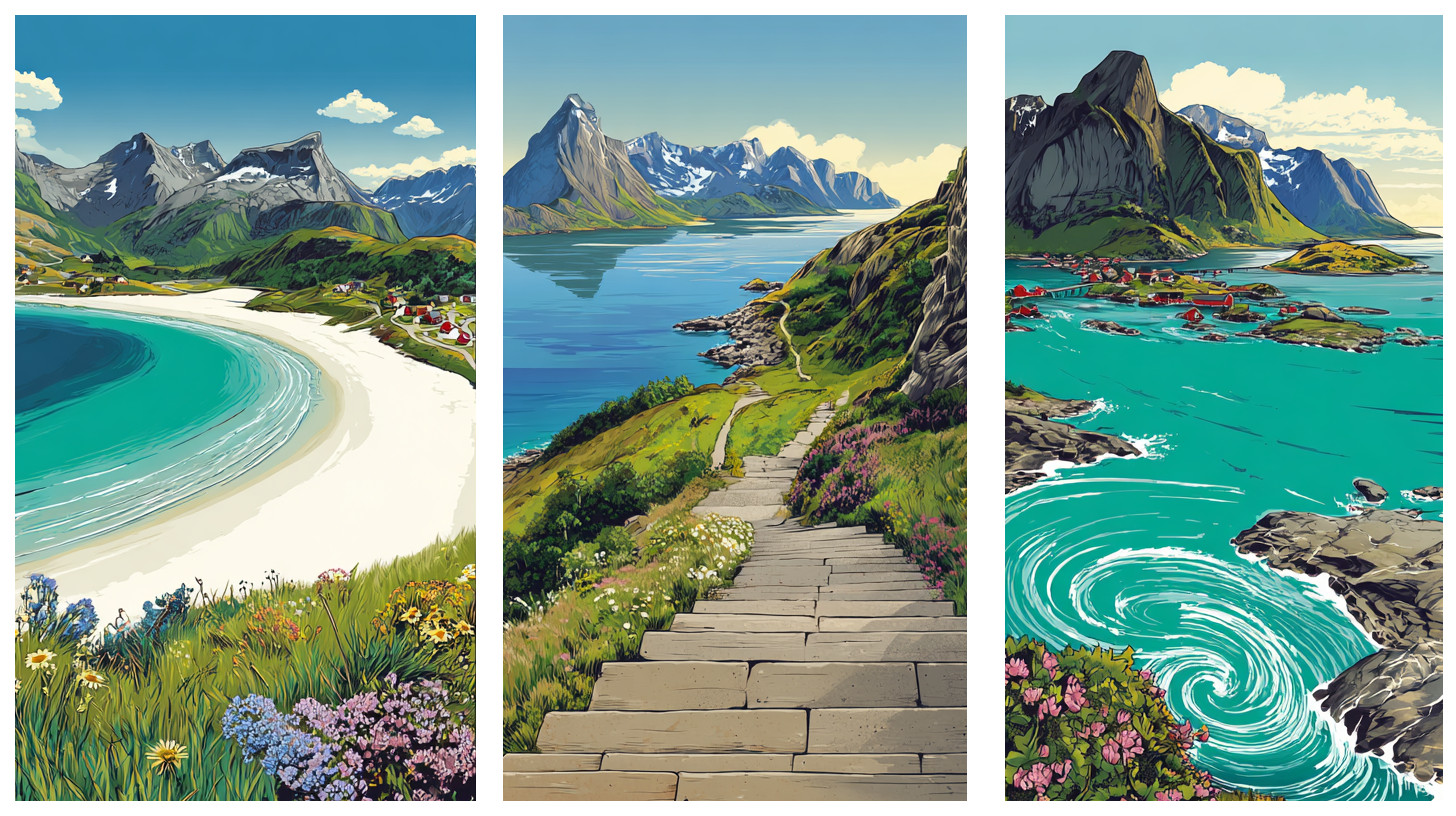 - Lofoten Scenic Route – winding roads past fjords, peaks, and fishing villages